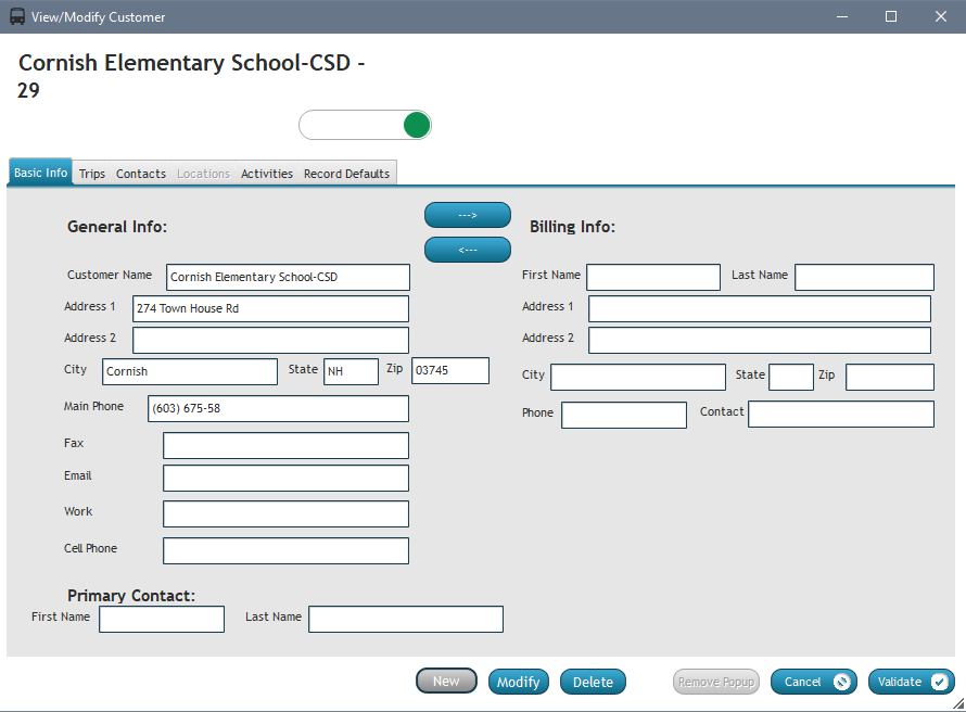 This information can be copied from one set to the other. On the customer overview window, you have the ability to complete basic info about a customer, as well as access lists of trips, contacts, locations, and activities that are specific to the customer you're looking at.