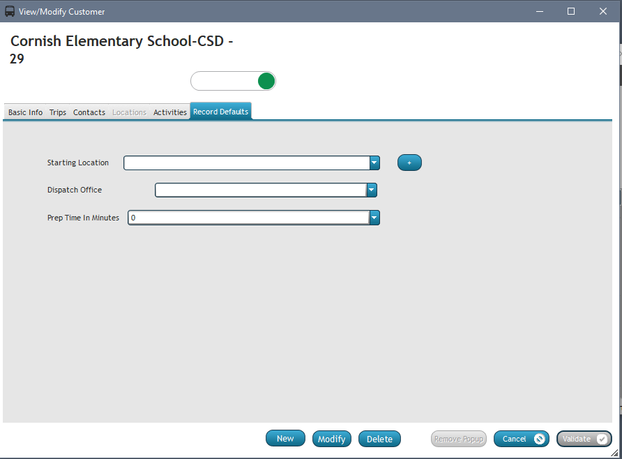 When entering a new trip from the customer record, this prep time is used to calculate the required arrival time ahead of the departure time. The system will default to 15 minutes prior to departure time for all customer records and trips unless this is customized on this record defaults tab.