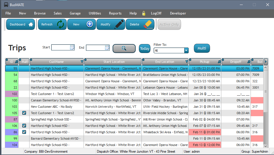 Below is the main listing for the Trips module. Note that it can be filtered based on date range, date range presets, and which dispatch office the trip will run from. The default view is always automatically set to the next 10 days from the current date.