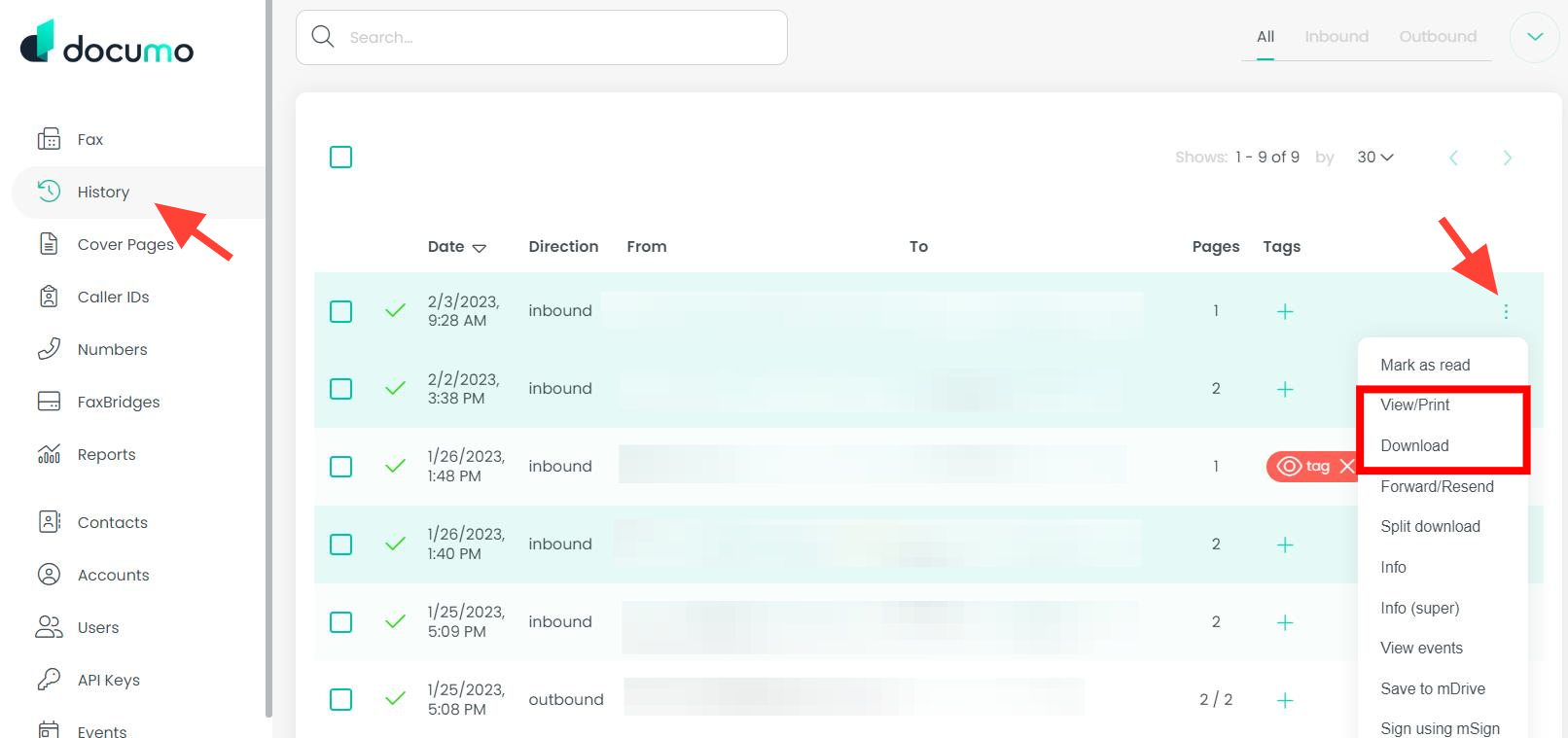 Click the 3 dots on the row of the fax you want to download/print.
